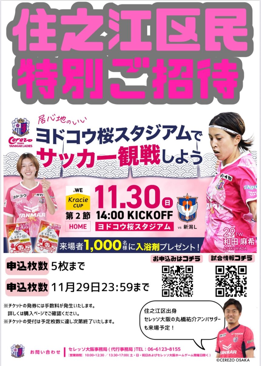 <長居> 区民応援デー開催!セレッソ大阪ヤンマーレディース×住之江区 2025年11月30日(日)