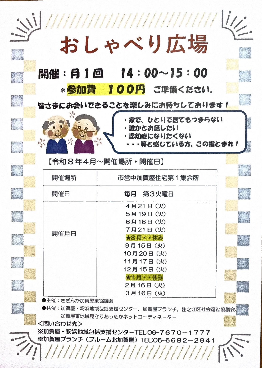 毎月 第3火曜日に市営中加賀屋住宅第1集会所にて 『おしゃべり広場』が開催されています!