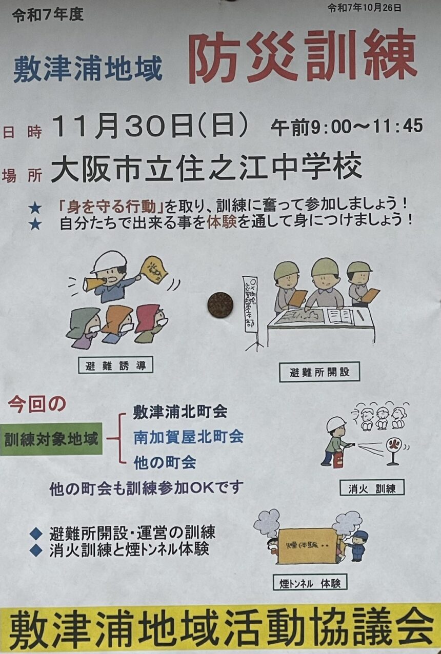 2025年11月30日(日)に『敷津浦地域 防災訓練』が開催されます!!
