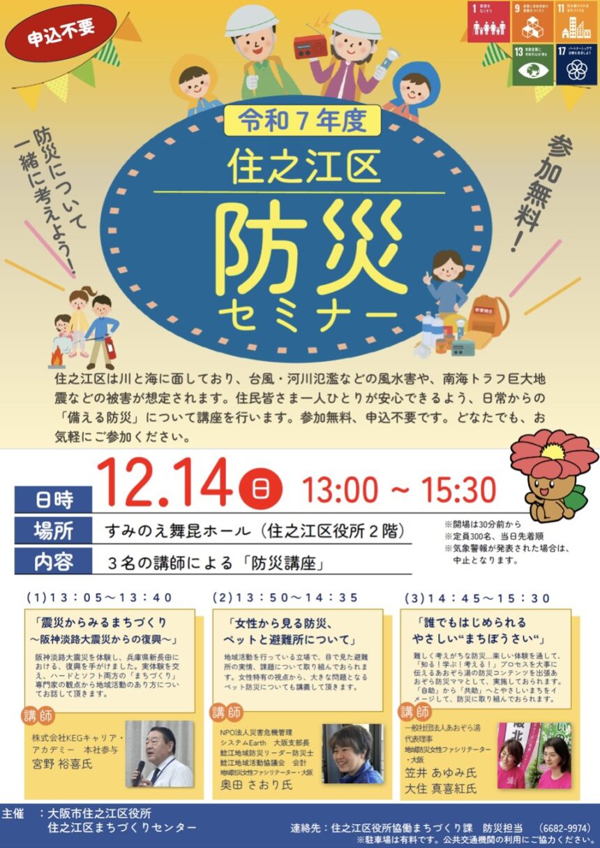 住之江区は川と海に面しており、台風や河川の氾濫などによる風水害、南海トラフ巨大地震などによる津波被害が想定されます。