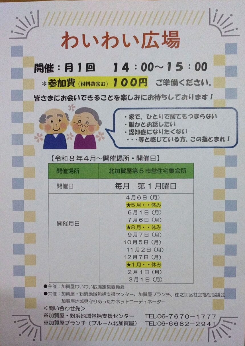 毎月第1月曜日に北加賀屋第5市営住宅集会所(北加賀屋東部福祉会館)にて