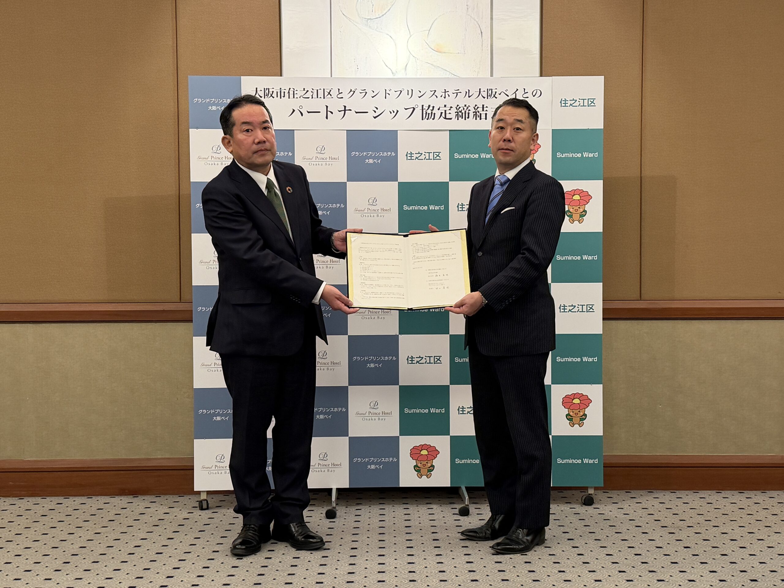 2026年3月25日、住之江区とグランドプリンスホテル大阪ベイによるパートナーシップ協定締結式が執り行われた。万博後やIRを見据えたベイエリアの発展、さらには地域の安全や次世代育成など、多角的な分野で官民が手を取り合う。