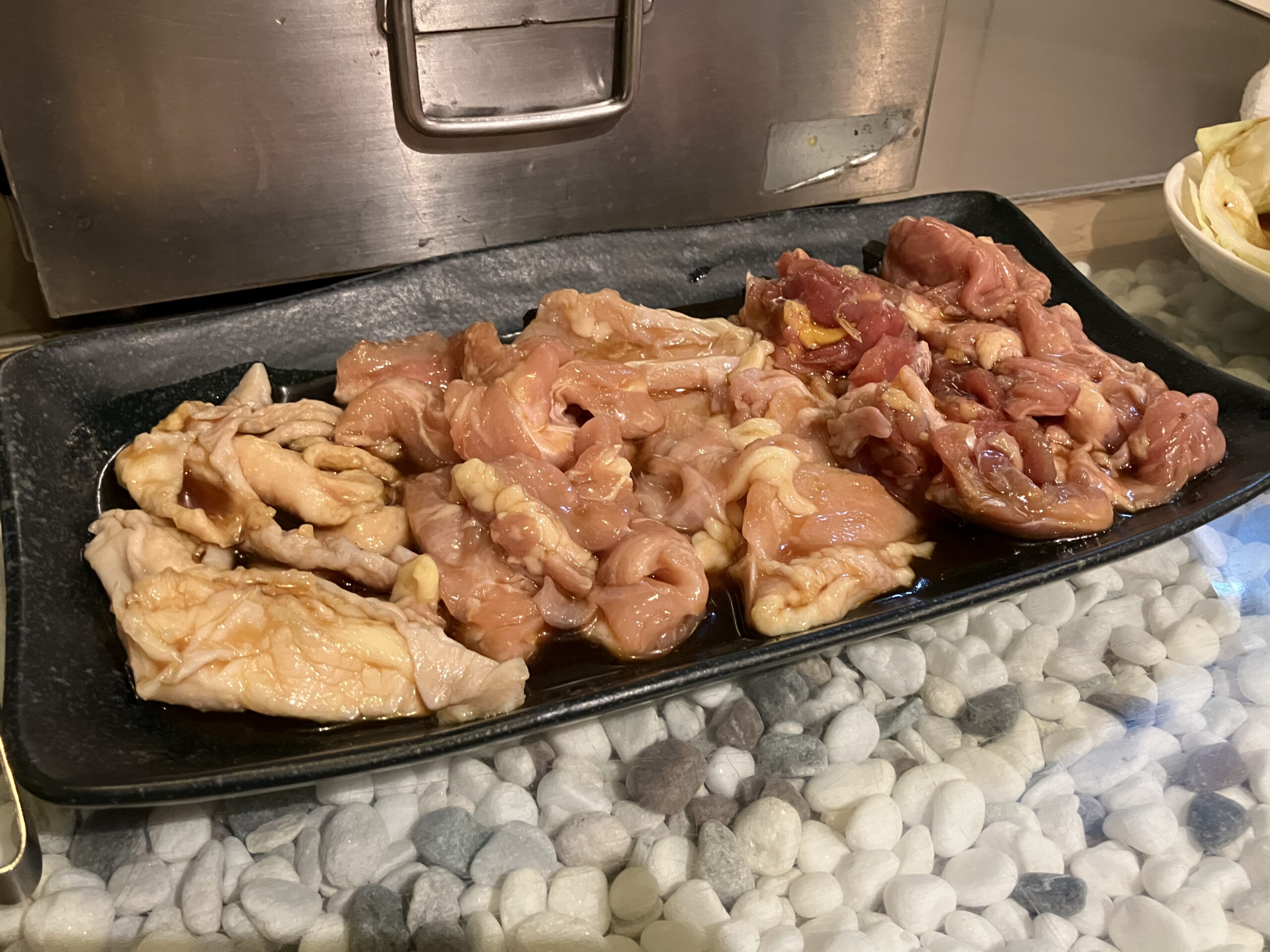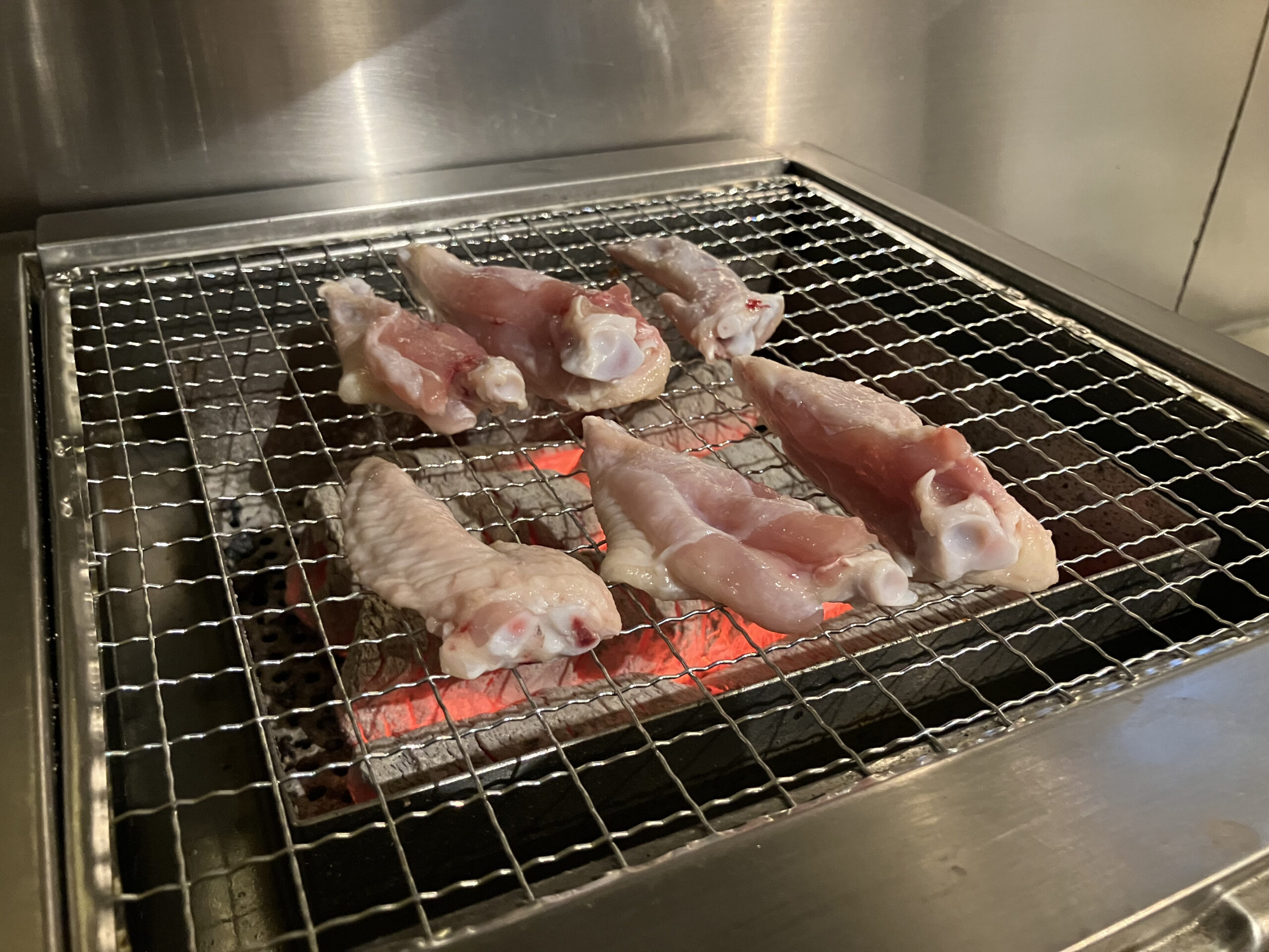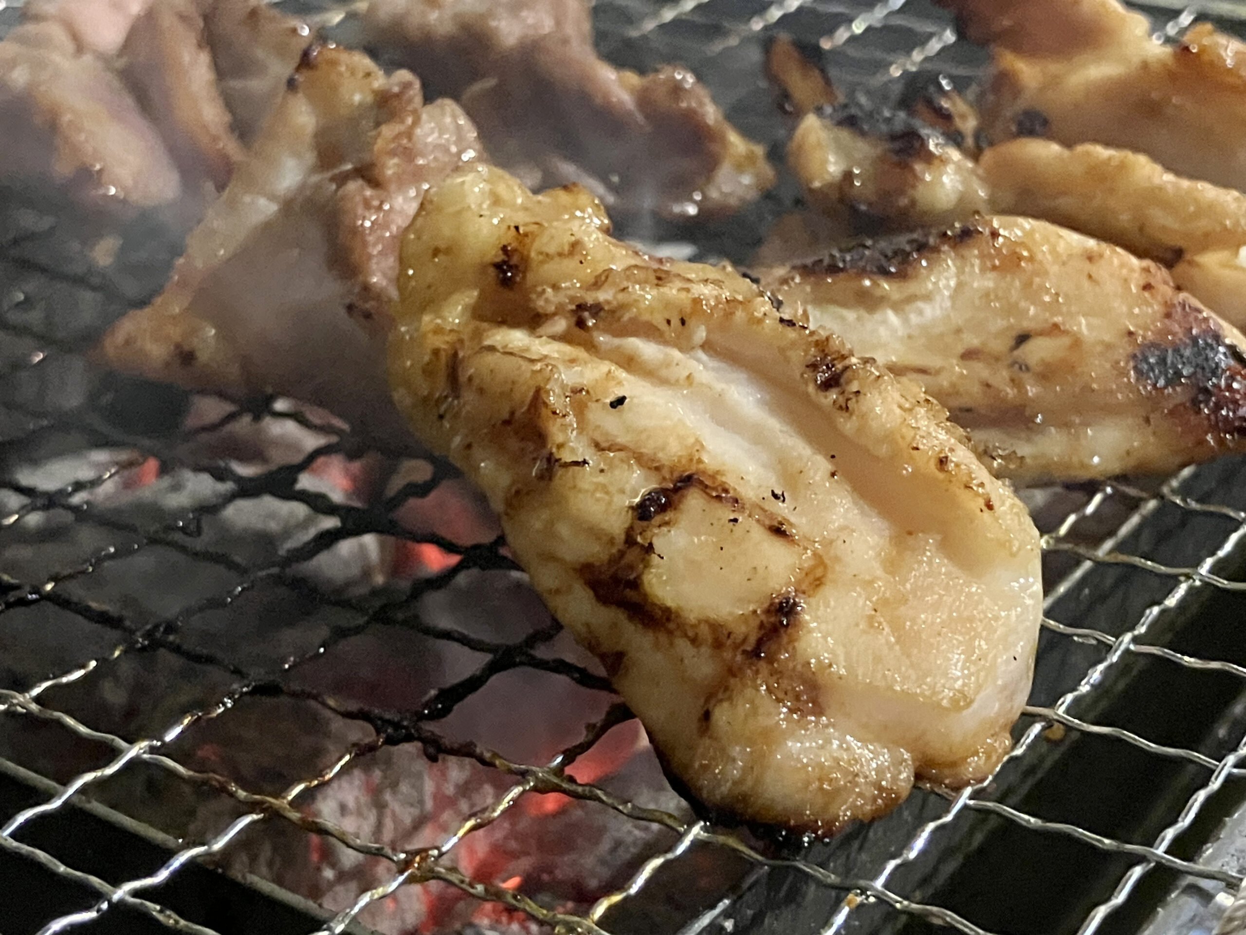 自分のテーブルに出された炭火でじっくり焼く鶏肉は、表面が香ばしくパリッと、中は驚くほどジューシー。