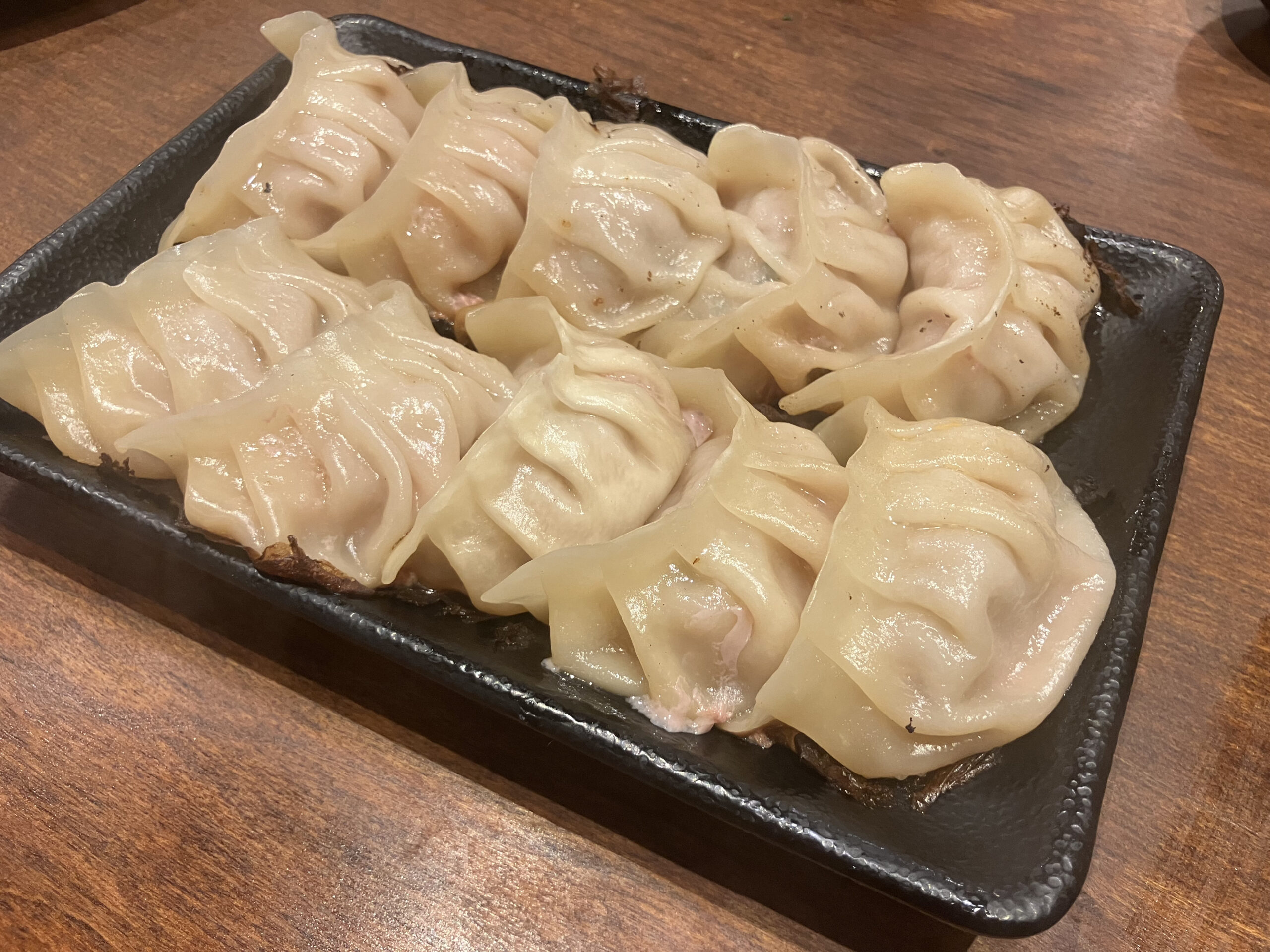 看板メニューの餃子は、皮がパリッと香ばしく、中からはジューシーな肉汁があふれる絶品。